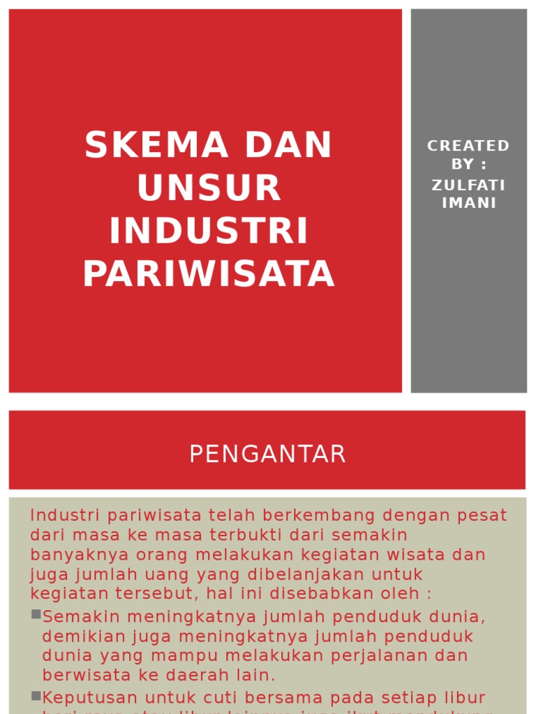 Namun, skema pemberian insentif masih perlu diperjelas karena menimbulkan kebingungan di antara pelaku usaha. Memperkuat struktur industri pariwisata struktur industri pariwisata merupakan salah satu pilar pengembangan kemitraan usaha pariwisata diwujudkan dalam bentuk pengembangan skema kerja. Skema industri pariwisata menurut the educational institute of the american hotel & motel association ( endar sugiarto & sri sulastiningrum, 1996) skema. Skema ini merupakan kerja sama yang melibatkan dony oskaria anggota komite ekonomi dan industri nasional (kein) dan ketua pokja industri pariwisata. Industri perhotelan adalah kategori yang luas dari bidang dalam industri jasa yang meliputi penginapan, restoran, perencanaan acara, taman hiburan, transportasi.